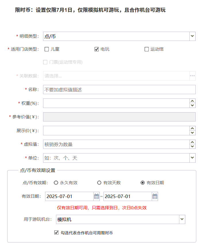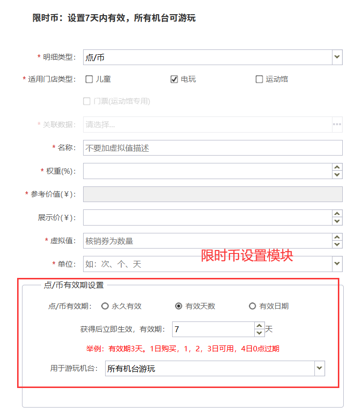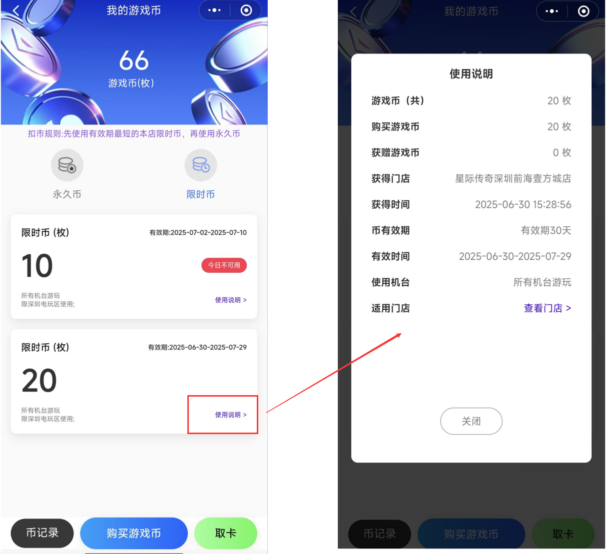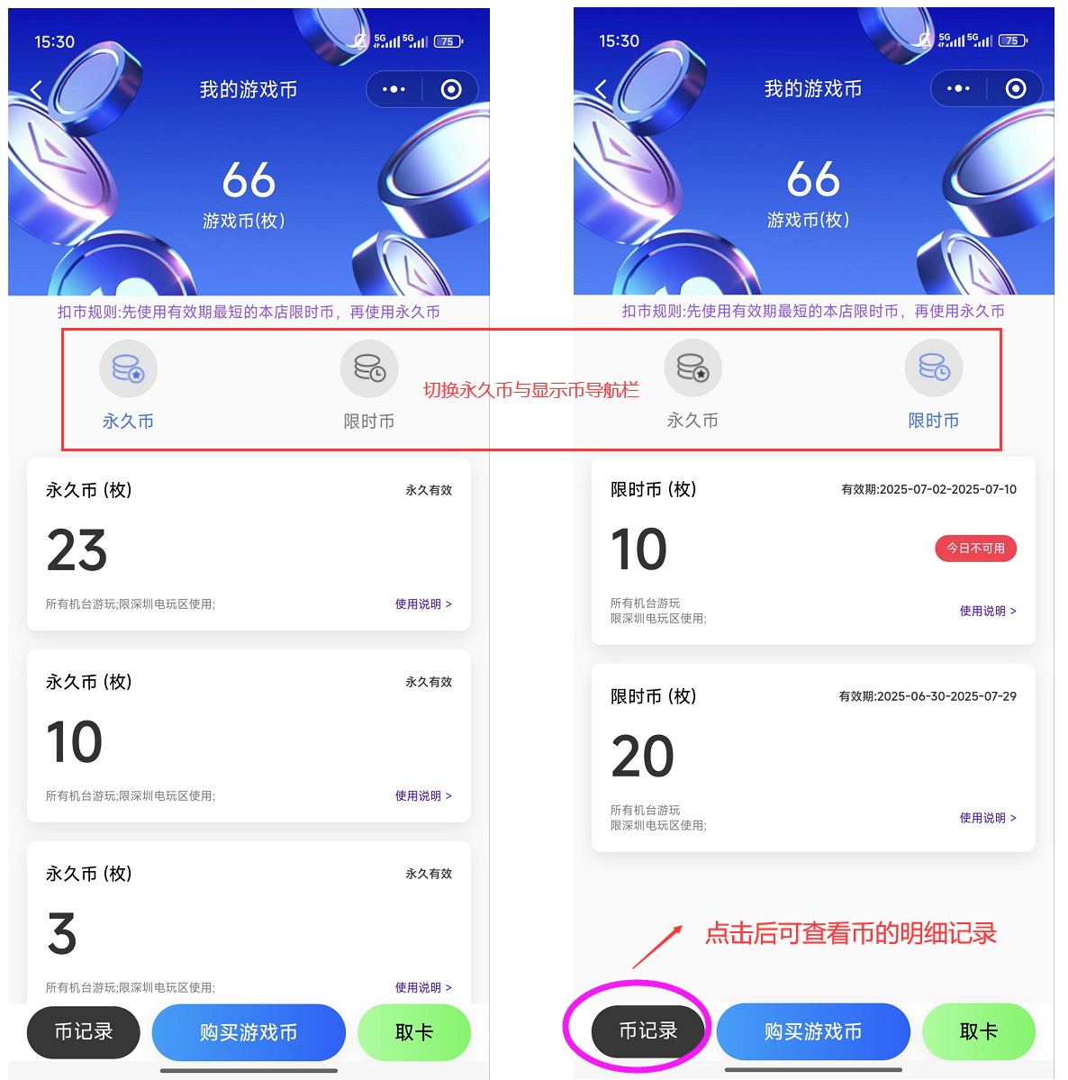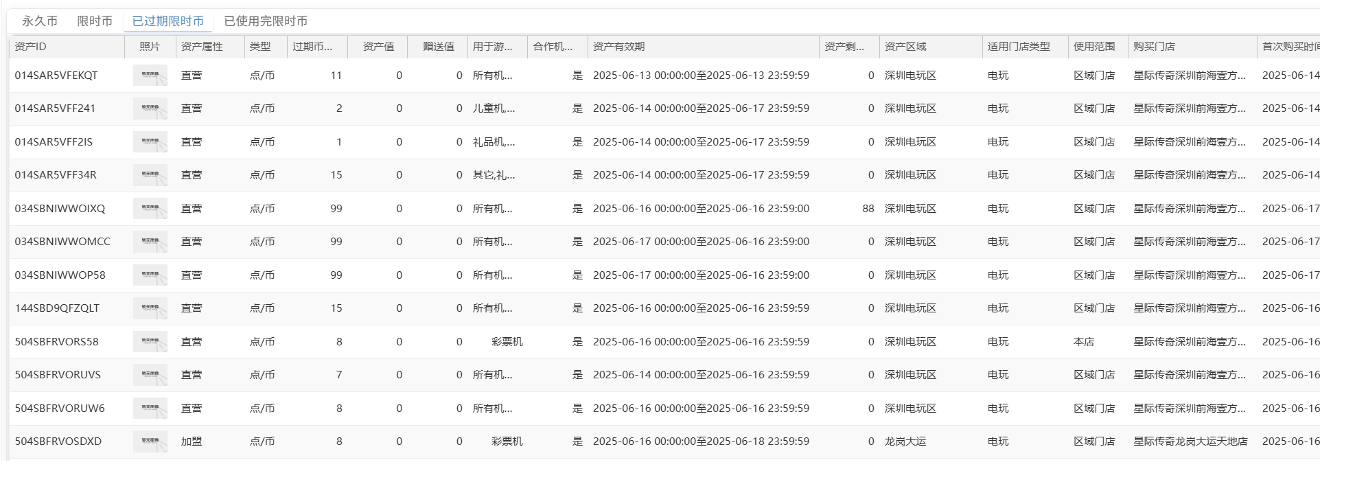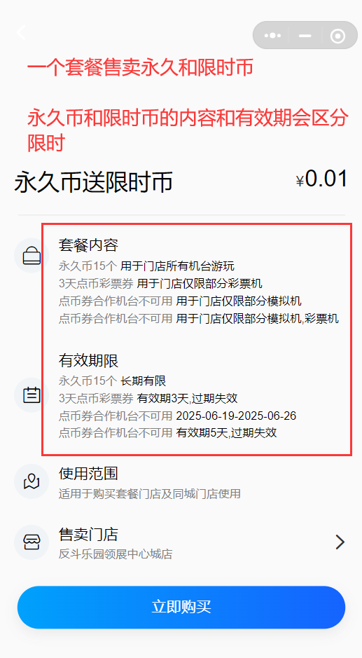 ### **==请门店尽快做一些指示牌,指引某些机台不可使用限时币;或划分仅限限时币使用专区等==** ## 限时币说明文档--持续更新 **1、什么是限时币?** 限时币是电玩业态的提出的一种特殊币玩法。限XX天内游玩、限部分类型机台游玩,限制合作机台不可游玩等。 限时币第一期只做限时天数,不做限周期和限时段。限时币一旦过期就失效,不可延期。 **2、限时币怎么获得?** 限时币获得有2种途径: 1、小程序购买点币套餐、第三方平台购买限时币套餐等。 2、营销活动(活动礼包、排行榜、抽奖等)赠送限时币、会员等级权益礼包赠送限时币等。 ==特别注意:零币套餐不支持设置限时币。因为不记名的零币,无法推送限时币到期提醒给客户知晓,会导致引起客诉。== **3、套餐管理中设置限时币有效期、适用机台类型** 不同于永久币(永久币是以前电玩的币种,永久有效,可叠加、适用于门店所有类型机台游玩)。限时币本期仅限制天数使用。**目前最大设置30天内有效,过期失效。目前设置限时币的数量最大为500个。** 1.相对时间:购币后3天内有效,从购币日开始算,比如1号购买,1,2,3日可用,4日0点过期。不可延期 2.固定有效期:可做预售,固定在某天可用,比如5月下旬预售6月1日可用的限时币。 3.可选择仅限部分机台使用,勾选代表合作机台可用。 ==永久币设置:以前老的电玩永久币选择该选项即可。==  ==限时币设置:根据实际情况可设置有效天数,固定有效期,适用游玩机台,以及合作机台是否可使用限时币==    **4、限时币扣币顺序** 用户同时拥有限时币与永久币,扣币顺序为:有效期>购买门店>资产属性>资产区域>剩余价值>永久币 **5、限时币退款** 客户如当天购买了限时币。 完全未使用的限时币当天可退款,找到该订单,点击退款即可操作; 已使用过的限时币,该笔订单不可退款。 **6、限时币取会员副卡** 限时币在正常有效期内取会员副卡,流程与永久币一致。 如限时币当天不可用,取会员副卡,会提示:没有适用于当前门店的“代币”资产。 比如限时币 7月1日-7月1日可用。今天6月30日取会员副卡,会提示:没有适用于当前门店的“代币”资产。  **7、限时币取会员副卡后插卡头游玩** 由于限时币限制了可用游戏机台,限制了合作机台。插会员副卡后,卡可用币数是指当前机台可用永久币和限时币的总和 当卡内余额不足时候,卡头会提醒卡内余额不足。  举例说明: 假设有200个永久币、100个仅限模拟机合作机台不可用的币、100个仅限彩票机合作机台可用的币 那么币总数是200+100+100=400个 把卡插到合作的模拟机,可用币数为200个 把卡插到非合作的模拟机,可用币数为200+100=300个 把卡插到合作的彩票机,可用币数为200+100=300个 把卡插到非合作的彩票机,可用币数为200个 把卡插到模拟机和彩票机以外的机台,可用币数为200个 **8、限时币临近过期提醒** 限时币到期前10天、5天、1天会通过小程序服务通知发送过期提醒通知  **9、限时币关于消耗方面注意事项** 限时币套餐:购买时进【销售表】。投币&过期时进【消耗表】。限时币过期【不可激活】。 **10、营销活动怎么设置限时币?** 营销活动:活动礼包、幸运大抽奖、存票大挑战、排行榜活动、会员等级赠送显示币。已全部可设置显示币。  **11、收银台展示用户的限时币** 收银台-资产-限时币查看客户可用显示币,已过期限时币,已使用完限时币   **12、会员资料管理查看用户的限时币** 会员资料管理查看客户可用显示币,已过期限时币,已使用完限时币   **13、小程序限时币展示** 小程序购买页面:如一个套餐售卖永久币和限时币,套餐内容(适用机台+有效期)会按明细区分展示   后台明细的名称是对应小程序里面显示的。所以明细类型取名字的时候把可以把数量也带上 比如 游戏币 改成 1300游戏币 比如 限时币 改成 100限时币 这样小程序里面的 套餐内容和有效期限 会比较清晰的知道多少币是用于什么机台,有效期是多久了 我的游戏币页面:上方显示总币数,包含永久币和限时币,下方分导航栏展示永久币和限时币明细  点击适用说明,弹框查看使用详情明细   游玩记录中查看显示币过期的明细,点击详细信息展开即可查看  **14、第三方平台购买限时币,对有效期的疑问**