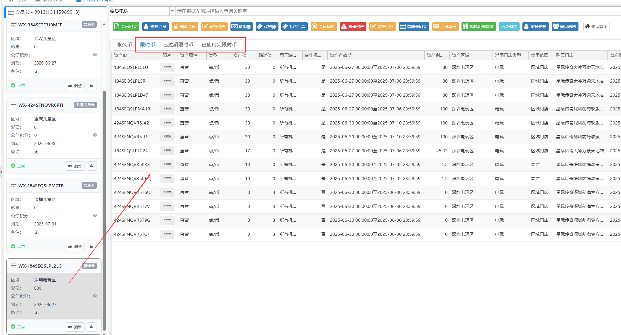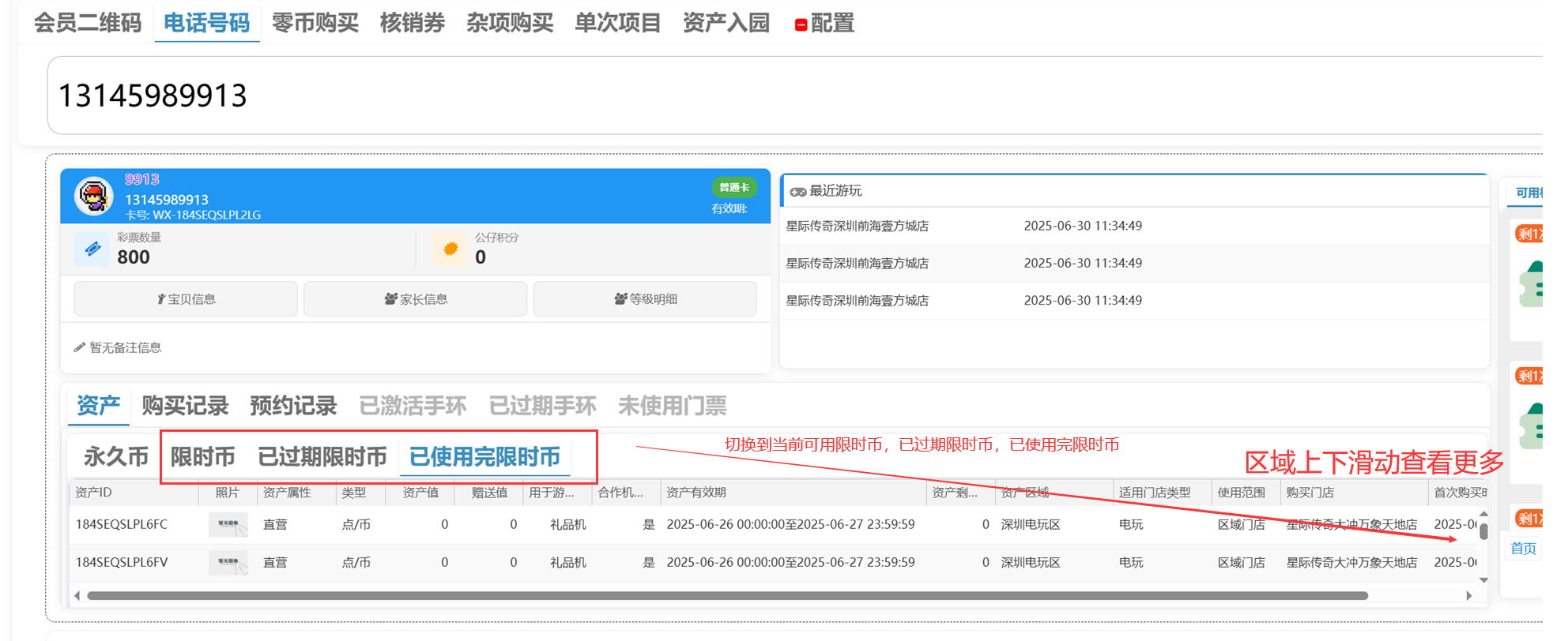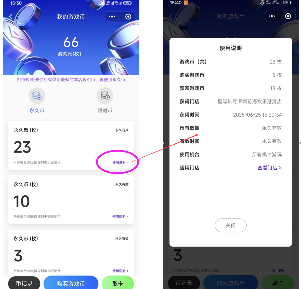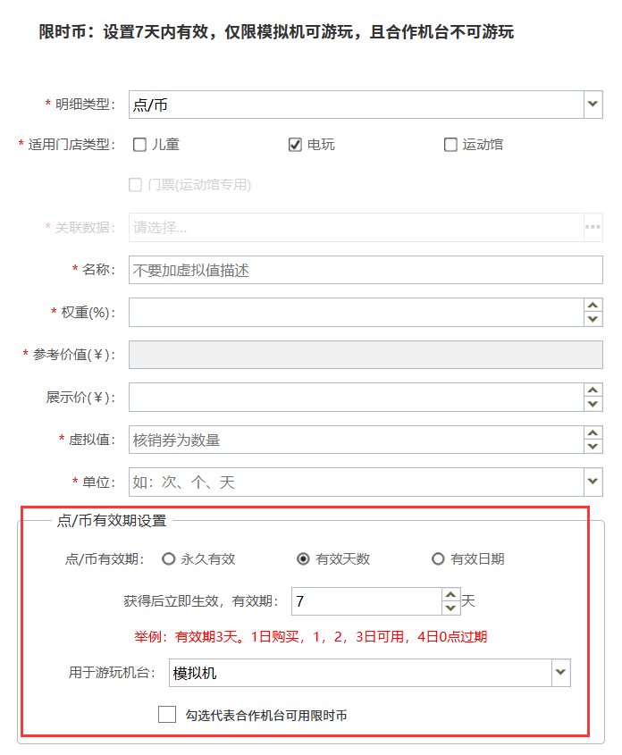 ### **==请门店尽快做一些指示牌,指引某些机台不可使用限时币;或划分仅限限时币使用专区等==** ## 限时币说明文档--持续更新 **1、什么是限时币?** 限时币是电玩业态的提出的一种特殊币玩法。限XX天内游玩、限部分类型机台游玩,限制合作机台不可游玩等。 限时币第一期只做限时天数,不做限周期和限时段。限时币一旦过期就失效,不可延期。 **2、限时币怎么获得?** 限时币获得有2种途径: 1、小程序购买点币套餐、第三方平台购买限时币套餐等。 2、营销活动(活动礼包、排行榜、抽奖等)赠送限时币、会员等级权益礼包赠送限时币等。 ==特别注意:零币套餐不支持设置限时币。因为不记名的零币,无法推送限时币到期提醒给客户知晓,会导致引起客诉。== **3、套餐管理中设置限时币有效期、适用机台类型** 不同于永久币(永久币是以前电玩的币种,永久有效,可叠加、适用于门店所有类型机台游玩)。限时币本期仅限制天数使用。**目前最大设置30天内有效,过期失效。目前设置限时币的数量最大为500个。** 1.相对时间:购币后3天内有效,从购币日开始算,比如1号购买,1,2,3日可用,4日0点过期。不可延期 2.固定有效期:可做预售,固定在某天可用,比如5月下旬预售6月1日可用的限时币。 3.可选择仅限部分机台使用,勾选代表合作机台可用。 ==永久币设置:以前老的电玩永久币选择该选项即可。==  ==限时币设置:根据实际情况可设置有效天数,固定有效期,适用游玩机台,以及合作机台是否可使用限时币==    **4、限时币扣币顺序** 用户同时拥有限时币与永久币,扣币顺序为:有效期>购买门店>资产属性>资产区域>剩余价值>永久币 **5、限时币退款** 客户如当天购买了限时币。 完全未使用的限时币当天可退款,找到该订单,点击退款即可操作; 已使用过的限时币,该笔订单不可退款。 **6、限时币取会员副卡** 限时币在正常有效期内取会员副卡,流程与永久币一致。 如限时币当天不可用,取会员副卡,会提示:没有适用于当前门店的“代币”资产。 比如限时币 7月1日-7月1日可用。今天6月30日取会员副卡,会提示:没有适用于当前门店的“代币”资产。  **7、限时币取会员副卡后插卡头游玩** 由于限时币限制了可用游戏机台,限制了合作机台。插会员副卡后,卡可用币数是指当前机台可用永久币和限时币的总和 当卡内余额不足时候,卡头会提醒卡内余额不足。  举例说明: 假设有200个永久币、100个仅限模拟机合作机台不可用的币、100个仅限彩票机合作机台可用的币 那么币总数是200+100+100=400个 把卡插到合作的模拟机,可用币数为200个 把卡插到非合作的模拟机,可用币数为200+100=300个 把卡插到合作的彩票机,可用币数为200+100=300个 把卡插到非合作的彩票机,可用币数为200个 把卡插到模拟机和彩票机以外的机台,可用币数为200个 **8、限时币临近过期提醒** 限时币到期前10天、5天、1天会通过小程序服务通知发送过期提醒通知  **9、限时币关于消耗方面注意事项** 限时币套餐:购买时进【销售表】。投币&过期时进【消耗表】。限时币过期【不可激活】。 **10、营销活动怎么设置限时币?** 营销活动:活动礼包、幸运大抽奖、存票大挑战、排行榜活动、会员等级赠送显示币。已全部可设置显示币。  **11、收银台展示用户的限时币** 收银台-资产-限时币查看客户可用显示币,已过期限时币,已使用完限时币   **12、会员资料管理查看用户的限时币** 会员资料管理查看客户可用显示币,已过期限时币,已使用完限时币   **13、小程序限时币展示** 小程序购买页面:如一个套餐售卖永久币和限时币,套餐内容(适用机台+有效期)会按明细区分展示   后台明细的名称是对应小程序里面显示的。所以明细类型取名字的时候把可以把数量也带上 比如 游戏币 改成 1300游戏币 比如 限时币 改成 100限时币 这样小程序里面的 套餐内容和有效期限 会比较清晰的知道多少币是用于什么机台,有效期是多久了 我的游戏币页面:上方显示总币数,包含永久币和限时币,下方分导航栏展示永久币和限时币明细  点击适用说明,弹框查看使用详情明细   游玩记录中查看显示币过期的明细,点击详细信息展开即可查看  **14、第三方平台购买限时币,对有效期的疑问**