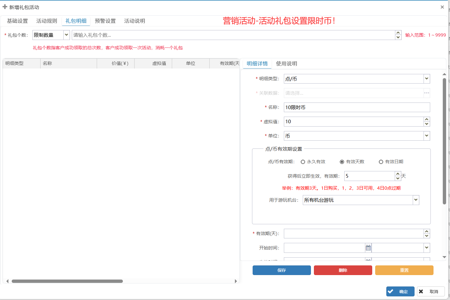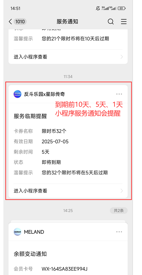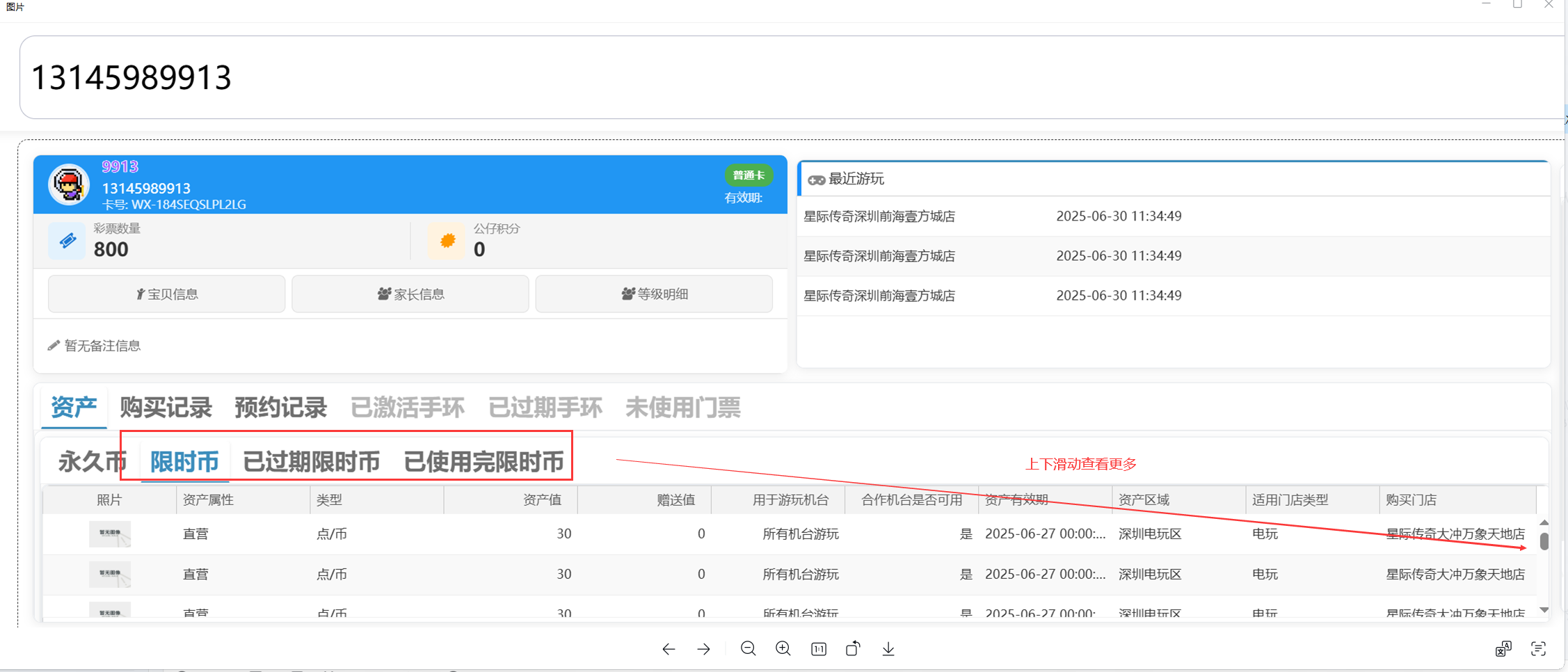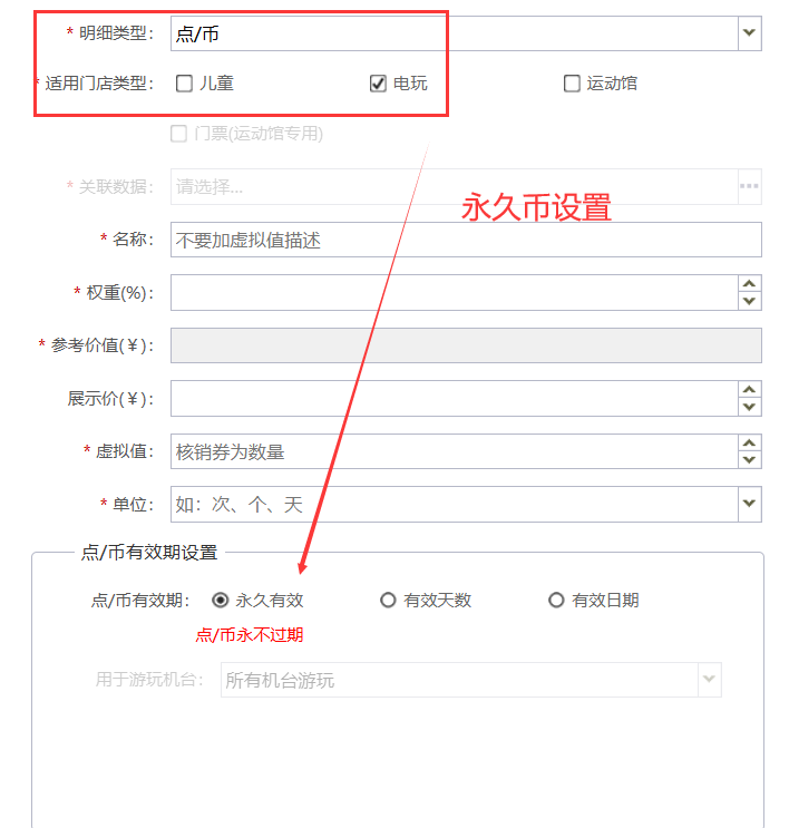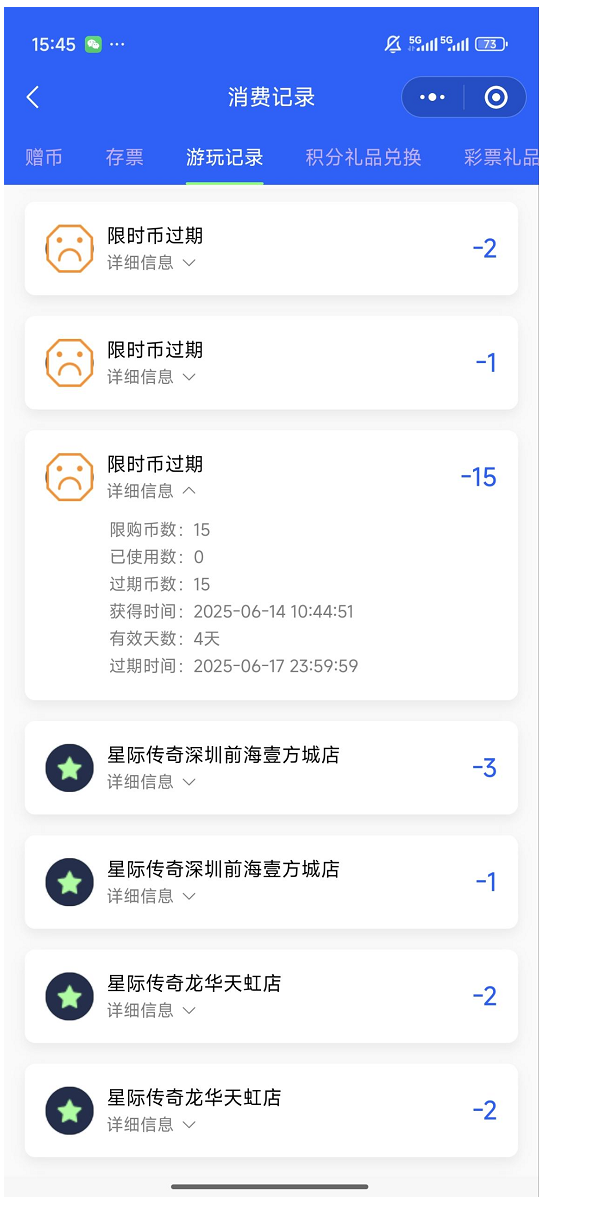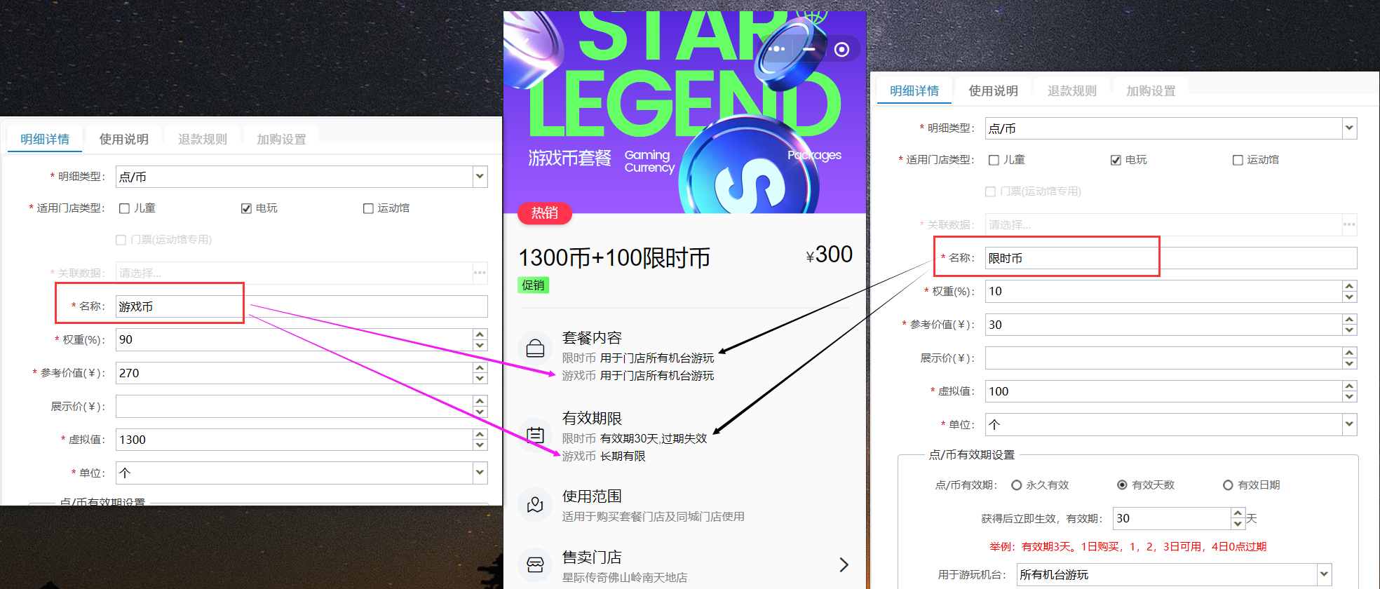### **==请门店尽快做一些指示牌,指引某些机台不可使用限时币;或划分仅限限时币使用专区等==** ## 限时币说明文档--持续更新 **1、什么是限时币?** 限时币是电玩业态的提出的一种特殊币玩法。限XX天内游玩、限部分类型机台游玩,限制合作机台不可游玩等。 限时币第一期只做限时天数,不做限周期和限时段。限时币一旦过期就失效,不可延期。 **2、限时币怎么获得?** 限时币获得有2种途径: 1、小程序购买点币套餐、第三方平台购买限时币套餐等。 2、营销活动(活动礼包、排行榜、抽奖等)赠送限时币、会员等级权益礼包赠送限时币等。 ==特别注意:零币套餐不支持设置限时币。因为不记名的零币,无法推送限时币到期提醒给客户知晓,会导致引起客诉。== **3、套餐管理中设置限时币有效期、适用机台类型** 不同于永久币(永久币是以前电玩的币种,永久有效,可叠加、适用于门店所有类型机台游玩)。限时币本期仅限制天数使用。**目前最大设置30天内有效,过期失效。目前设置限时币的数量最大为500个。** 1.相对时间:购币后3天内有效,从购币日开始算,比如1号购买,1,2,3日可用,4日0点过期。不可延期 2.固定有效期:可做预售,固定在某天可用,比如5月下旬预售6月1日可用的限时币。 3.可选择仅限部分机台使用,勾选代表合作机台可用。 ==永久币设置:以前老的电玩永久币选择该选项即可。==  ==限时币设置:根据实际情况可设置有效天数,固定有效期,适用游玩机台,以及合作机台是否可使用限时币==    **4、限时币扣币顺序** 用户同时拥有限时币与永久币,扣币顺序为:有效期>购买门店>资产属性>资产区域>剩余价值>永久币 **5、限时币退款** 客户如当天购买了限时币。 完全未使用的限时币当天可退款,找到该订单,点击退款即可操作; 已使用过的限时币,该笔订单不可退款。 **6、限时币取会员副卡** 限时币在正常有效期内取会员副卡,流程与永久币一致。 如限时币当天不可用,取会员副卡,会提示:没有适用于当前门店的“代币”资产。 比如限时币 7月1日-7月1日可用。今天6月30日取会员副卡,会提示:没有适用于当前门店的“代币”资产。  **7、限时币取会员副卡后插卡头游玩** 由于限时币限制了可用游戏机台,限制了合作机台。插会员副卡后,卡可用币数是指当前机台可用永久币和限时币的总和 当卡内余额不足时候,卡头会提醒卡内余额不足。  举例说明: 假设有200个永久币、100个仅限模拟机合作机台不可用的币、100个仅限彩票机合作机台可用的币 那么币总数是200+100+100=400个 把卡插到合作的模拟机,可用币数为200个 把卡插到非合作的模拟机,可用币数为200+100=300个 把卡插到合作的彩票机,可用币数为200+100=300个 把卡插到非合作的彩票机,可用币数为200个 把卡插到模拟机和彩票机以外的机台,可用币数为200个 **8、限时币临近过期提醒** 限时币到期前10天、5天、1天会通过小程序服务通知发送过期提醒通知  **9、限时币关于消耗方面注意事项** 限时币套餐:购买时进【销售表】。投币&过期时进【消耗表】。限时币过期【不可激活】。 **10、营销活动怎么设置限时币?** 营销活动:活动礼包、幸运大抽奖、存票大挑战、排行榜活动、会员等级赠送显示币。已全部可设置显示币。  **11、收银台展示用户的限时币** 收银台-资产-限时币查看客户可用显示币,已过期限时币,已使用完限时币   **12、会员资料管理查看用户的限时币** 会员资料管理查看客户可用显示币,已过期限时币,已使用完限时币   **13、小程序限时币展示** 小程序购买页面:如一个套餐售卖永久币和限时币,套餐内容(适用机台+有效期)会按明细区分展示   后台明细的名称是对应小程序里面显示的。所以明细类型取名字的时候把可以把数量也带上 比如 游戏币 改成 1300游戏币 比如 限时币 改成 100限时币 这样小程序里面的 套餐内容和有效期限 会比较清晰的知道多少币是用于什么机台,有效期是多久了 我的游戏币页面:上方显示总币数,包含永久币和限时币,下方分导航栏展示永久币和限时币明细  点击适用说明,弹框查看使用详情明细   游玩记录中查看显示币过期的明细,点击详细信息展开即可查看  **14、第三方平台购买限时币,对有效期的疑问**