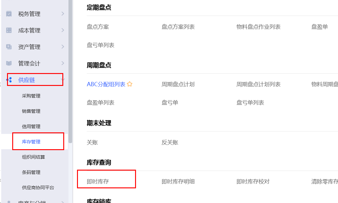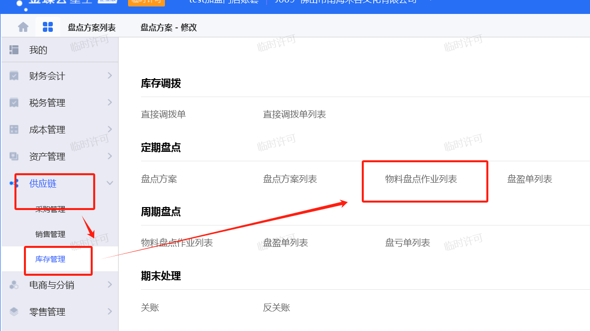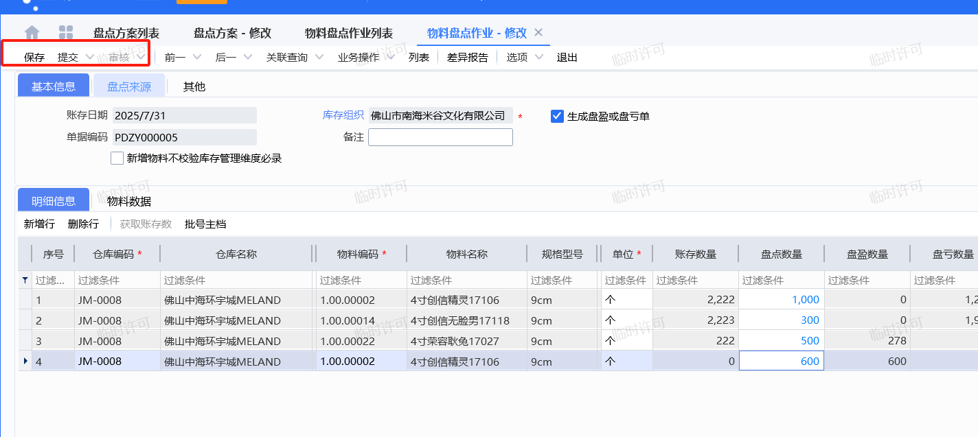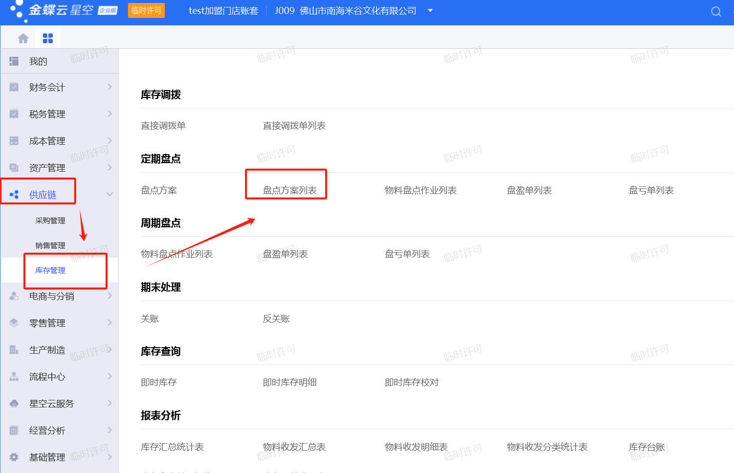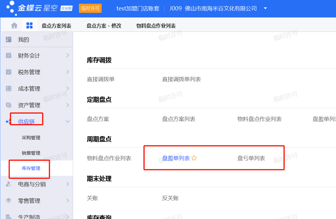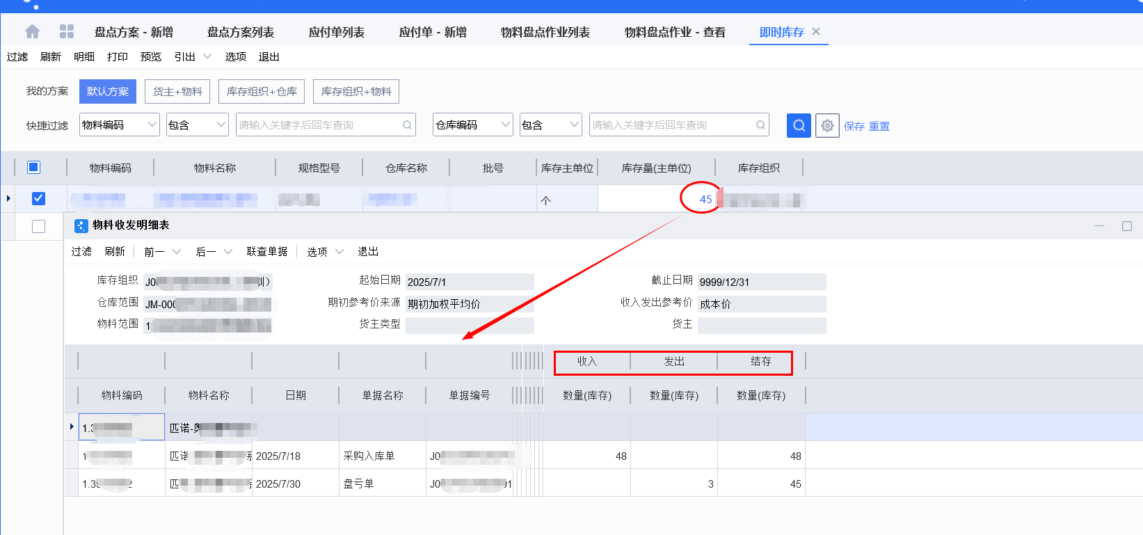 **1.设置盘点方案** 用途:制订盘点方案,用来确定盘点范围,比如要盘哪些仓库、哪些物料等 **① 路径** 点击【供应链】→【库存管理】→【盘点方案列表】  **②操作** 步骤一、点击进入盘点方案列表,点击【新增】  步骤二: 进入盘点方案界面,维护相关字段信息: ==字段填写说明:== * 盘点名称:由门店自定义输入 * 截至日期:什么时候盘点截至日期就是什么时候(取物料收发汇总表截止日期的结存) * 仓库编码:默认为空,表示该组织下所有仓库都进行盘点;若只盘某个仓库,选择对应仓库即可 * 物料编码:默认为空,表示该组织下所有物料都进行盘点;若只盘某个物料,选择对应物料即可  步骤三:维护好相关信息之后,点击【保存】【提交】【审核】(注:若有出入库单据未审核,盘点方案将会审核失败,需根据系统给出的提示将对应单据审核)  **2.物业盘点作业** 用途:盘点方案审核后,会自动生成物料盘点作业;门店进行实际盘点,然后把实际盘点数据录入物料盘点作业 **① 路径** 可在盘点方案直接点击查询物料盘点作业  也可点击【供应链】→【库存管理】→【物料盘点作业列表】  **②操作** 步骤一:进入物料盘点作业列表,双击进入单据中  步骤二:根据实际盘点情况,录入盘点数量; ==注:**盘点过程如有其他物料没在盘点作业表中,可点击【新增行】,维护对应仓库、物料、及盘点数量**==  步骤三:维护好相关信息后,点击【保存】【提交】【审核】  **3、盘盈盘亏单** 物料盘点作业审核后,系统会自动生成已审核状态的盘盈盘亏单,直接更新库存; 查看方法一:在物料盘点作业列表点击查询盘盈单、盘亏单  查看方法二:点击【供应链】→【库存管理】→【盘盈单列表】、【盘亏单列表】  **4、库存查询** 系统盘点完成之后,可在即时库存查看库存情况,复核系统中的库存数量是否与实物相符 ①路径: 【供应链】→【库存管理】→【即时库存】  **②操作:** 点击即时库存后,可查看到对应物料、对应仓库的库存量  若对库存数量有意义,可点击库存量(主单位)列下对应物料的库存数量,系统会跳转显示出该物料具体入库出库的情况