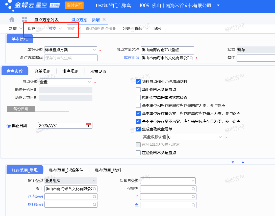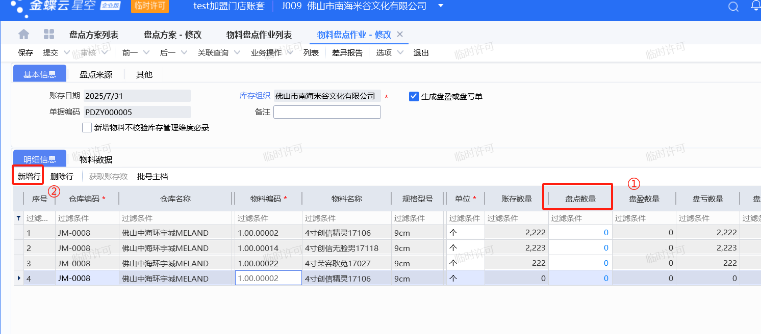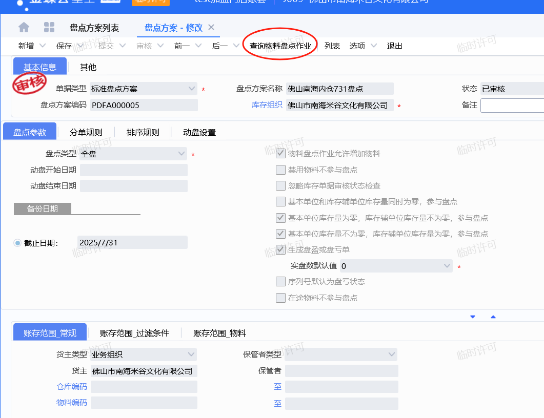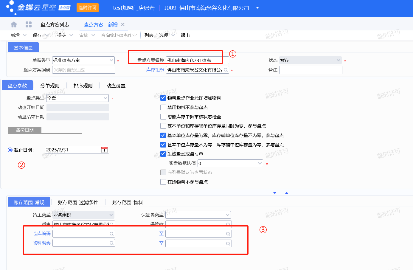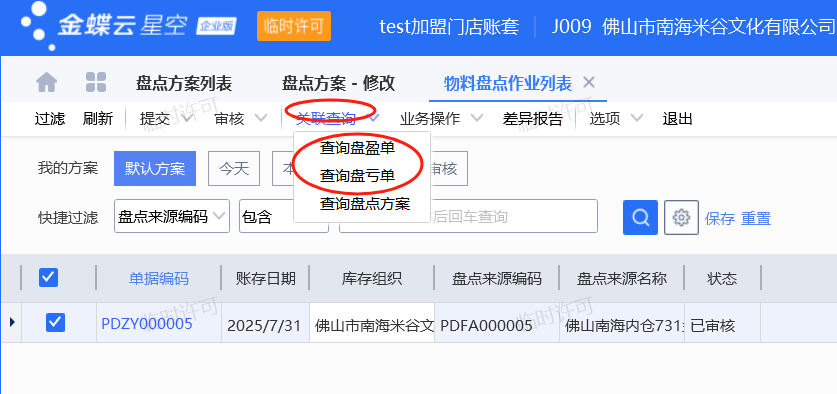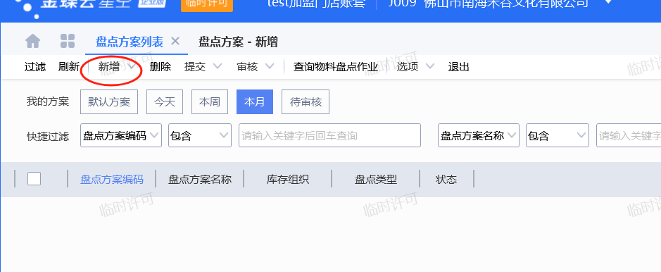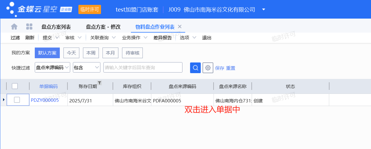 **1.设置盘点方案** 用途:制订盘点方案,用来确定盘点范围,比如要盘哪些仓库、哪些物料等 **① 路径** 点击【供应链】→【库存管理】→【盘点方案列表】  **②操作** 步骤一、点击进入盘点方案列表,点击【新增】  步骤二: 进入盘点方案界面,维护相关字段信息: ==字段填写说明:== * 盘点名称:由门店自定义输入 * 截至日期:什么时候盘点截至日期就是什么时候(取物料收发汇总表截止日期的结存) * 仓库编码:默认为空,表示该组织下所有仓库都进行盘点;若只盘某个仓库,选择对应仓库即可 * 物料编码:默认为空,表示该组织下所有物料都进行盘点;若只盘某个物料,选择对应物料即可  步骤三:维护好相关信息之后,点击【保存】【提交】【审核】(注:若有出入库单据未审核,盘点方案将会审核失败,需根据系统给出的提示将对应单据审核)  **2.物业盘点作业** 用途:盘点方案审核后,会自动生成物料盘点作业;门店进行实际盘点,然后把实际盘点数据录入物料盘点作业 **① 路径** 可在盘点方案直接点击查询物料盘点作业  也可点击【供应链】→【库存管理】→【物料盘点作业列表】  **②操作** 步骤一:进入物料盘点作业列表,双击进入单据中  步骤二:根据实际盘点情况,录入盘点数量; ==注:**盘点过程如有其他物料没在盘点作业表中,可点击【新增行】,维护对应仓库、物料、及盘点数量**==  步骤三:维护好相关信息后,点击【保存】【提交】【审核】  **3、盘盈盘亏单** 物料盘点作业审核后,系统会自动生成已审核状态的盘盈盘亏单,直接更新库存; 查看方法一:在物料盘点作业列表点击查询盘盈单、盘亏单  查看方法二:点击【供应链】→【库存管理】→【盘盈单列表】、【盘亏单列表】  **4、库存查询** 系统盘点完成之后,可在即时库存查看库存情况,复核系统中的库存数量是否与实物相符 ①路径: 【供应链】→【库存管理】→【即时库存】  **②操作:** 点击即时库存后,可查看到对应物料、对应仓库的库存量  若对库存数量有意义,可点击库存量(主单位)列下对应物料的库存数量,系统会跳转显示出该物料具体入库出库的情况