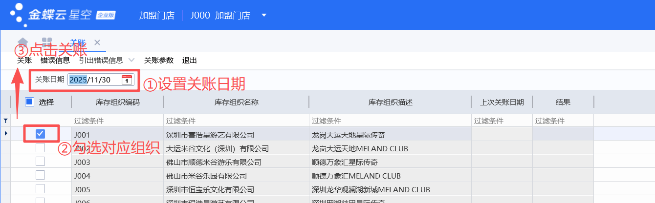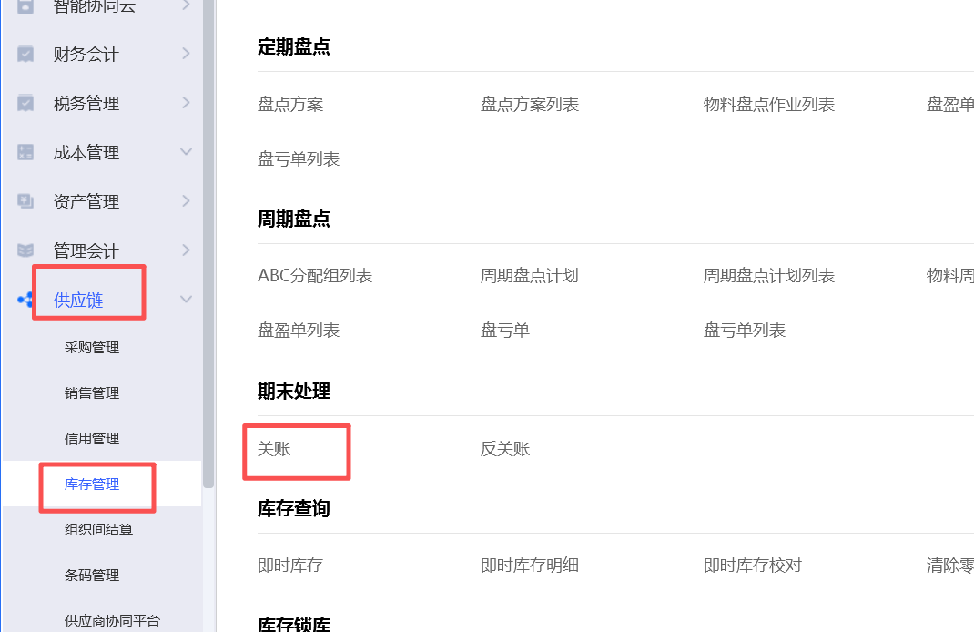 **1.设置盘点方案** 用途:制订盘点方案,用来确定盘点范围,比如要盘哪些仓库、哪些物料等 **① 路径** 点击【供应链】→【库存管理】→【盘点方案列表】  **②操作** 步骤一、点击进入盘点方案列表,点击【新增】  步骤二: 进入盘点方案界面,维护相关字段信息: ==字段填写说明:== * 盘点名称:由门店自定义输入 * 截至日期:什么时候盘点截至日期就是什么时候(取物料收发汇总表截止日期的结存) * 仓库编码:默认为空,表示该组织下所有仓库都进行盘点;若只盘某个仓库,选择对应仓库即可 * 物料编码:默认为空,表示该组织下所有物料都进行盘点;若只盘某个物料,选择对应物料即可  步骤三:维护好相关信息之后,点击【保存】【提交】【审核】(注:若有出入库单据未审核,盘点方案将会审核失败,需根据系统给出的提示将对应单据审核)  **2.物业盘点作业** 用途:盘点方案审核后,会自动生成物料盘点作业;门店进行实际盘点,然后把实际盘点数据录入物料盘点作业 **① 路径** 可在盘点方案直接点击查询物料盘点作业  也可点击【供应链】→【库存管理】→【物料盘点作业列表】  **②操作** 步骤一:进入物料盘点作业列表,双击进入单据中  步骤二:根据实际盘点情况,录入盘点数量; ==注:**盘点过程如有其他物料没在盘点作业表中,可点击【新增行】,维护对应仓库、物料、及盘点数量**==  步骤三:维护好相关信息后,点击【保存】【提交】【审核】  **3、盘盈盘亏单** 物料盘点作业审核后,系统会自动生成已审核状态的盘盈盘亏单,直接更新库存; 查看方法一:在物料盘点作业列表点击查询盘盈单、盘亏单  查看方法二:点击【供应链】→【库存管理】→【盘盈单列表】、【盘亏单列表】  **4、库存查询** 系统盘点完成之后,可在即时库存查看库存情况,复核系统中的库存数量是否与实物相符 ①路径: 【供应链】→【库存管理】→【即时库存】  **②操作:** 点击即时库存后,可查看到对应物料、对应仓库的库存量  若对库存数量有意义,可点击库存量(主单位)列下对应物料的库存数量,系统会跳转显示出该物料具体入库出库的情况  **5、库存关账** 核算月确认库存数据无误后,需进行库存关账 **①路径:** 【供应链】→【库存管理】→【关账】  **②操作:** 设置关账日期→勾选对应组织→点击【关账】