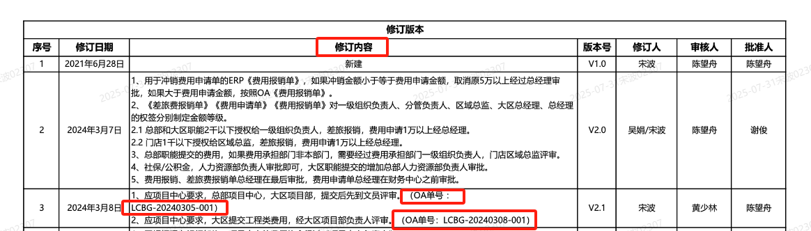 ### 更新审批权限表的方式 两个方式: 1、打印出来,给相关人签字,将纸件扫描留档 如下是历史签字的扫描件,后续更新的审批记录,请见:15、权签表,中的修订记录。 [【附件】2025/07/31/人力资源管理权限表V2.0.pdf](https://picgo.melands.cn/file/2025/07/31/%E4%BA%BA%E5%8A%9B%E8%B5%84%E6%BA%90%E7%AE%A1%E7%90%86%E6%9D%83%E9%99%90%E8%A1%A8V2.0.pdf) [【附件】2025/07/31/采购审批权限表.pdf](https://picgo.melands.cn/file/2025/07/31/%E9%87%87%E8%B4%AD%E5%AE%A1%E6%89%B9%E6%9D%83%E9%99%90%E8%A1%A8.pdf) [【附件】2025/07/31/费用权签,鲍总、吴姐授权委托.pdf](https://picgo.melands.cn/file/2025/07/31/%E8%B4%B9%E7%94%A8%E6%9D%83%E7%AD%BE%EF%BC%8C%E9%B2%8D%E6%80%BB%E3%80%81%E5%90%B4%E5%A7%90%E6%8E%88%E6%9D%83%E5%A7%94%E6%89%98.pdf) [【附件】2025/07/31/合同审批权限表V2.0.pdf](https://picgo.melands.cn/file/2025/07/31/%E5%90%88%E5%90%8C%E5%AE%A1%E6%89%B9%E6%9D%83%E9%99%90%E8%A1%A8V2.0.pdf) [【附件】2025/07/31/采购合同,定价审批权签表.pdf](https://picgo.melands.cn/file/2025/07/31/%E9%87%87%E8%B4%AD%E5%90%88%E5%90%8C%EF%BC%8C%E5%AE%9A%E4%BB%B7%E5%AE%A1%E6%89%B9%E6%9D%83%E7%AD%BE%E8%A1%A8.pdf) 2、提交OA《152 系统开发/优化、流程新增/优化审批单》,说明原因,变更的内容,更新授权表,并且在修订记录中记录好OA审批单号。  ### 审批授权表会签人 1. 《LD-GMO-M001-F02费用审批权限表》 修改由财务中心发起,或其他部门发起会签给财务中心评审通过,如果变更总经理审批范围,需要会签总经理。 1. 《LD-GMO-M001-F04采购管理审批权限表》 修改由采购部发起,或其他部门发起会签给采购部评审通过,如果变更总经理审批范围,需要会签总经理。 1. 《LD-GMO-M001-F06采购合同审批权限表》 修改由采购部发起,或其他部门发起会签给采购部评审通过,如果变更总经理审批范围,需要会签总经理。 1. 《LD-GMO-M001-F05数据审批权限表》 修改由总经办或财务中心发起,或其他部门发起会签给“信息披露组(王涣之总、陈望舟总、康健总”评审通过,如果变更总经理审批范围,需要会签总经理。 1. 《LD-GMO-M001-F03人力资源管理权限表》 修改由人力资源部发起,或其他部门发起会签给人力资源部评审通过,如果变更总经理审批范围,需要会签总经理。 1. 《LD-GMO-M001-F01合同审批权限表》 会签给总经办王涣之总、财务陈望舟总,和管理该业务部门的负责人评审通过,如果变更总经理审批范围,需要会签总经理。 ### 审批授权表的发布: 将最新的审批授权表更新在OA — 规章制度 — 审批权限表中  ### 前台查询位置: