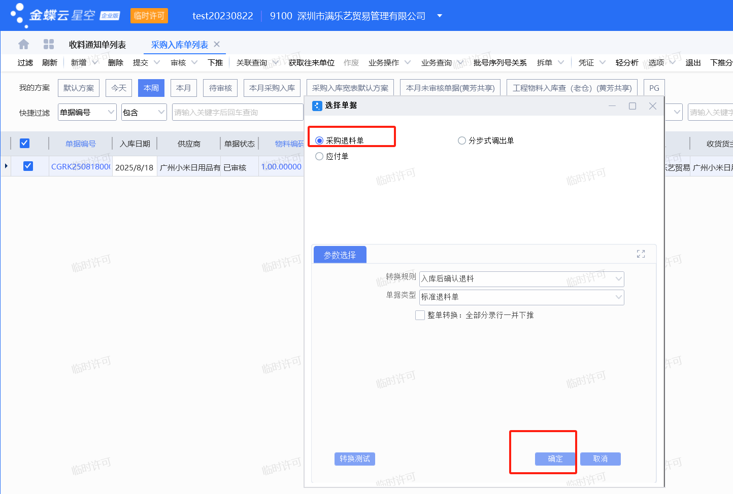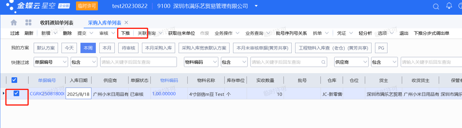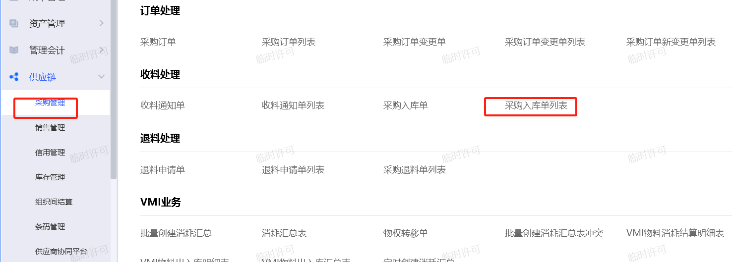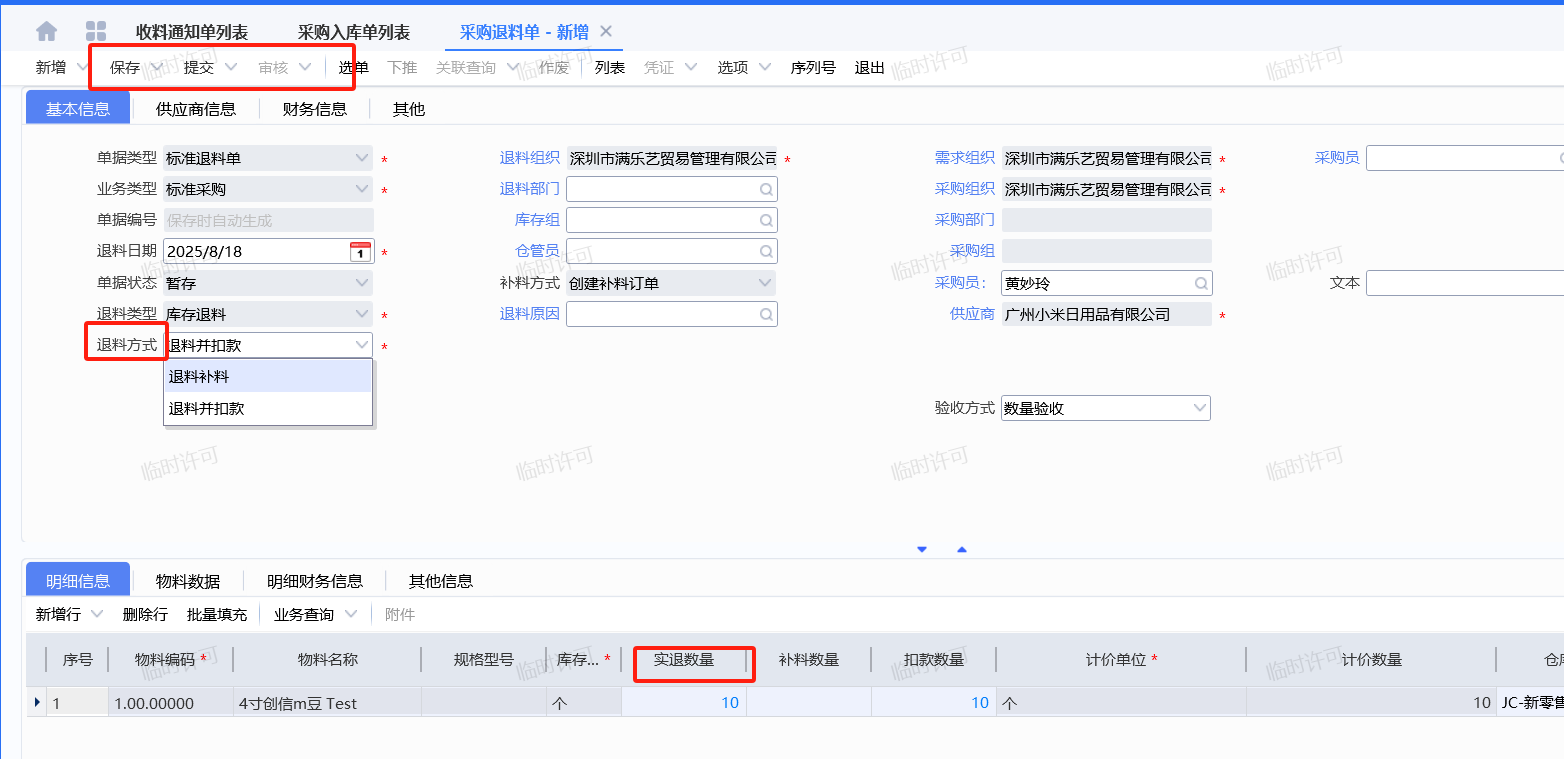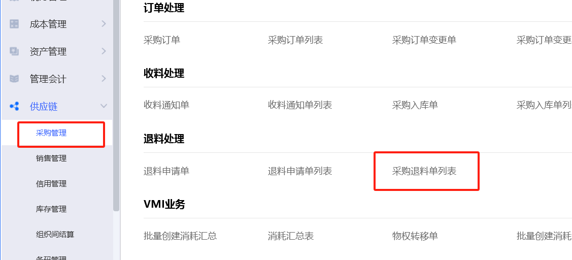1.采购退料 **1.1路径** 【供应链】→【采购管理】→【退料处理】→【采购退料单列表】  **1.2操作步骤** 用途:入库后发生退料,根据采购入库单进行下推退料单 **1.1路径** 【供应链】→【采购管理】→【收料处理】→【采购入库列表】  **1.2操作步骤** 步骤一:在【采购管理】→【收料处理】→【采购入库列表】→勾选对应采购入库单据→点击【下推】→选择【采购退料】→点击【确定】   步骤二:点击确定后,跳转至采购退料单界面,确认退货数量等信息→点击【保存】【提交】【审核】状态会更新为已审核,表示退料完成 ==注:退料方式区别:== **退料补料:**,在使用的过程中发现有质量问题需要向供应商退料并需扣除这部分退料数量的应付款项,退料方式选择退料并扣款。 **退料并扣款:**在使用的过程中发现有质量问题需要向供应商退料并重新补料入库,退料方式选择退料补料。