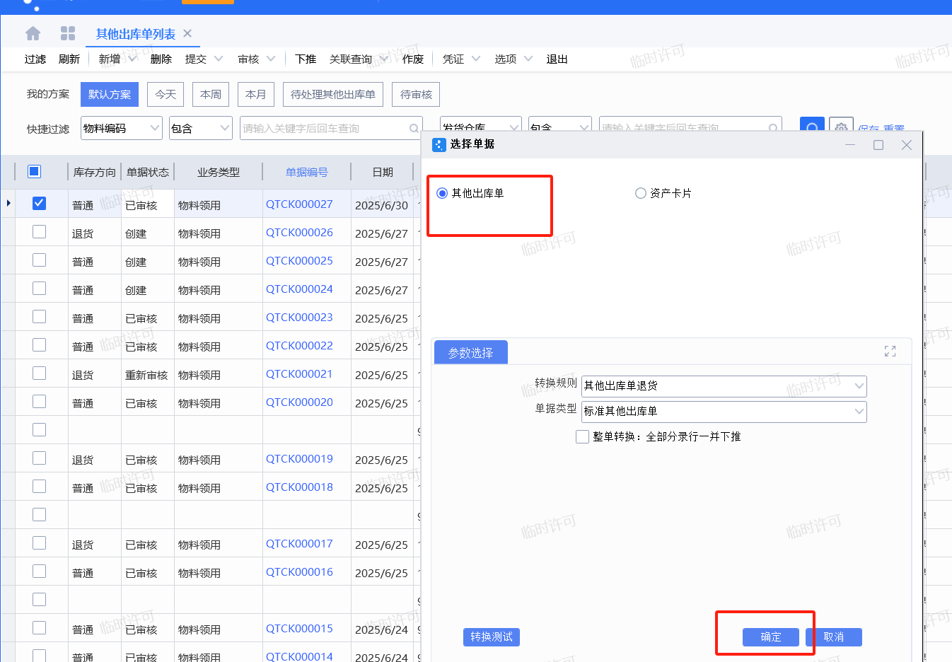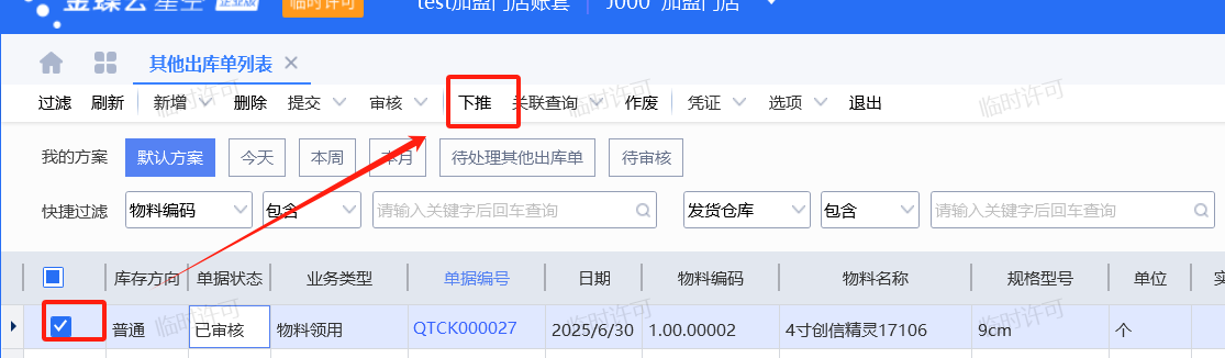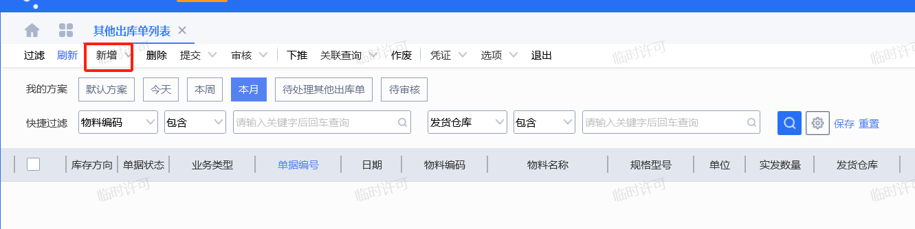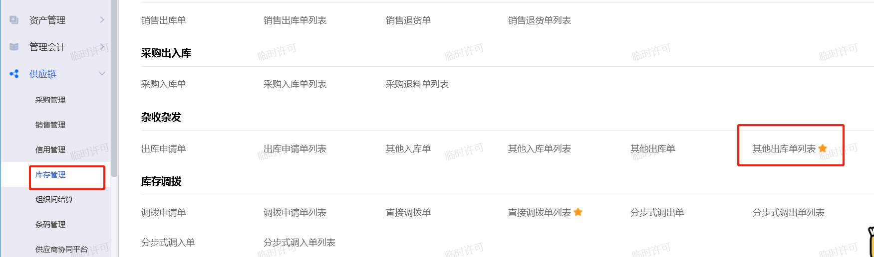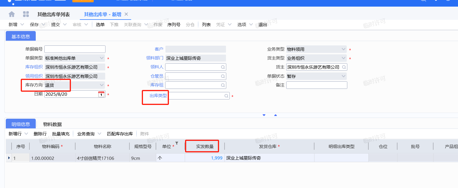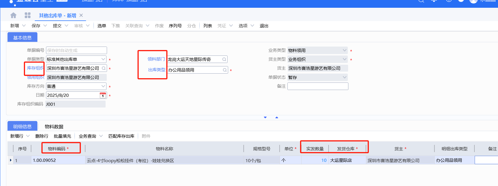 1.其他出库 **1.1路径** 【供应链】→【库存管理】→【其他出库单列表】  **1.2操作步骤** 步骤一:进入其他出库列表中,点击【新增】按钮  步骤二:点击新增后,录入库存组织、领料部门、出库类型、物料编码、实发数量、仓库等信息→再提交【保存】、【提交】、【审核】,单据状态更新为已审核,表示出库完成  2、其他出库退货 若已经出库发生退货情况,则根据以下方式处理: 步骤一:在其他出库单列表找到对应单据,点击【下推】按钮  步骤二:选择【其他出库单】,点击确定  步骤三:其他出库单库存方向为:退货,维护退货数量 点击保存提交审核即可