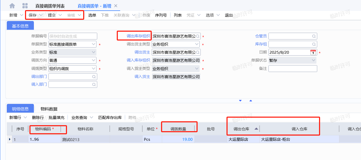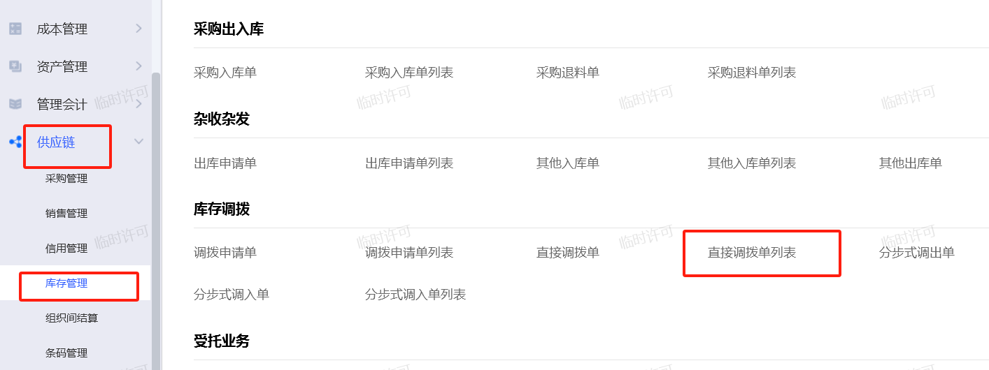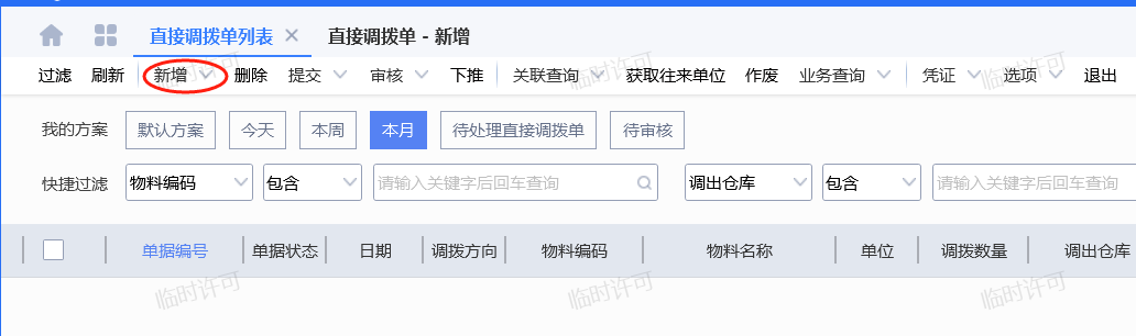 1、直接调拨单 用途:门店内仓库物料调拨 **1.1 路径**  **1.2操作步骤** 步骤一:进入直接调拨单列表中,点击【新增】按钮  步骤二:点击新增后,录入调出库存组织、物料编码、调拨数量、调出调入仓库等信息→再提交【保存】、【提交】、【审核】,单据状态更新为已审核,表示调拨完成