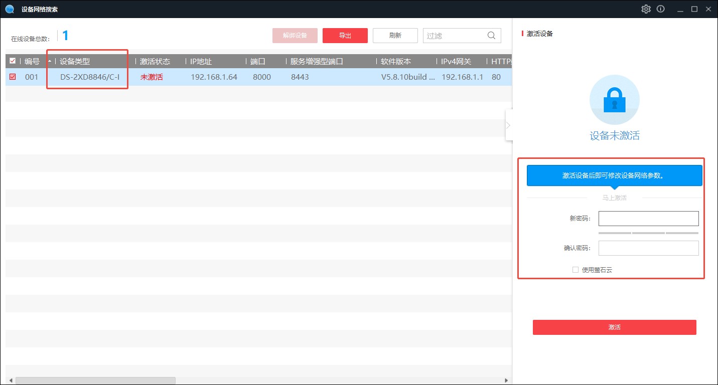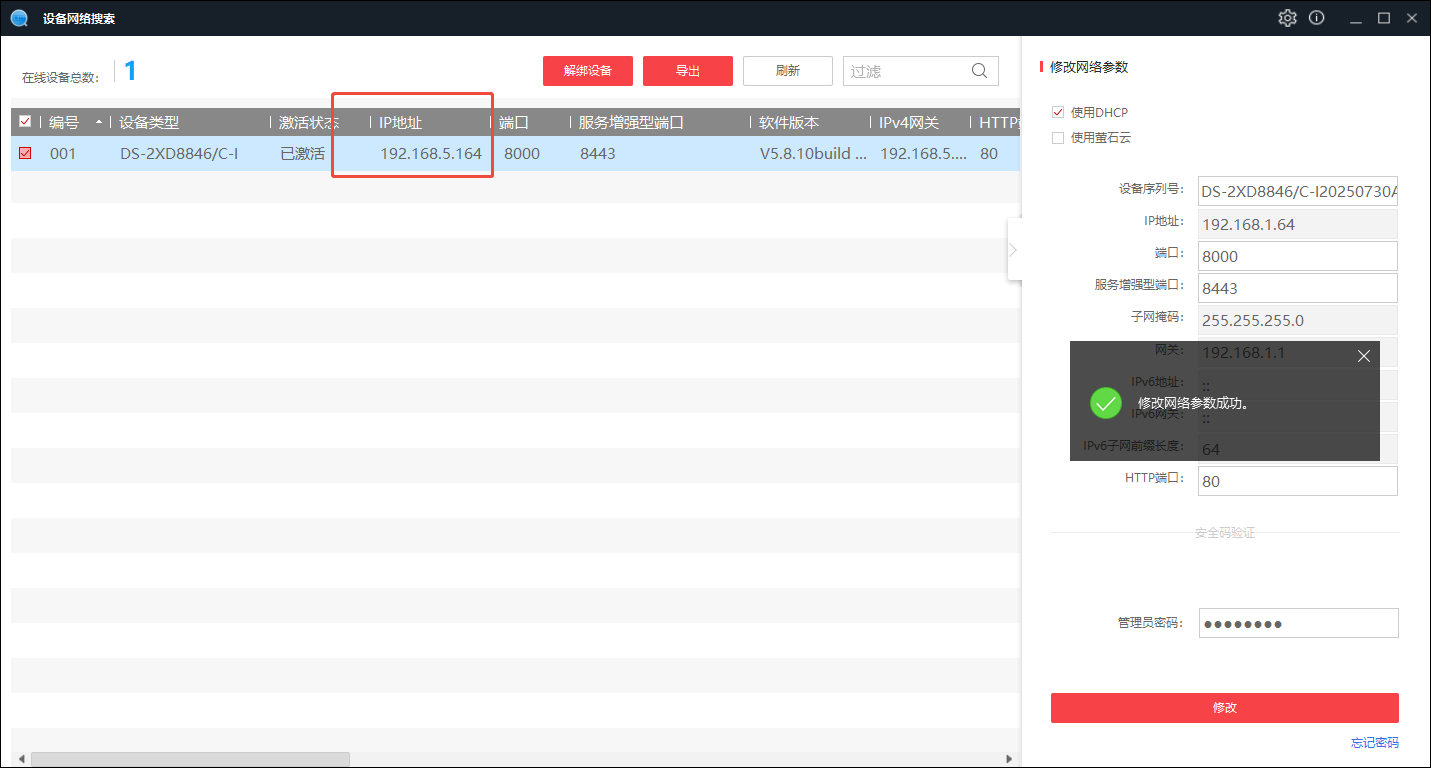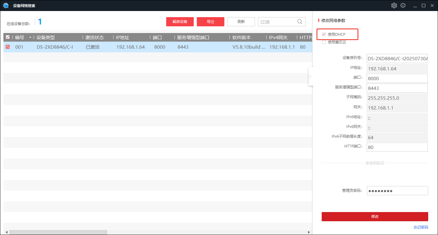 ### 1.下载SADP软件 官方下载地址:[设备网络搜索](https://partners.hikvision.com/tools/tooldetail?id=599912016971890688) [【附件】2025/08/25/SADP_1746738612558.zip](https://picgo.melands.cn/file/2025/08/25/SADP_1746738612558.zip) ### 2.解压并安装SADP ### 3.电脑接入和客流摄像头同一个交换机 ### 4.打开SADP软件,找到DS-2XD8846/C-I设置密码并激活   ### 5.激活成功,启用DHCP  ### 6.查看DHCP分配的IP地址,记录并发送给信息部相关同事