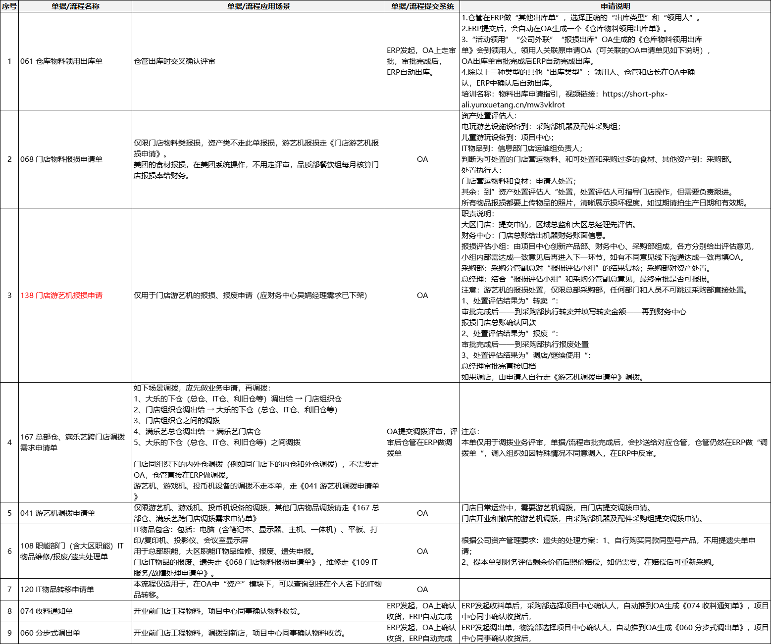 ##### 应用场景 ##### (点一下文字内容可放大)  <span style="color:white;"> 序号 单据/流程名称 单据/流程应用场景 单据/流程提交系统 申请说明 1 061 仓库物料领用出库单 仓管出库时交叉确认评审 ERP发起,OA上走审批,审批完成后,ERP自动出库。 "1.仓管在ERP做“其他出库单”,选择正确的“出库类型”和“领用人”。 2.ERP提交后,会自动在OA生成一个《仓库物料领用出库单》。 3.“活动领用”“公司外联”“报损出库”OA生成的《仓库物料领用出库 单》会到领用人,领用人关联原申请OA(可关联的OA申请单见如下说明), OA出库单审批完成后ERP自动完成出库。 4.除以上三种类型的其他“出库类型”:领用人、仓管和店长在OA中确 认,ERP中确认后自动出库。 培训名称:物料出库申请指引,视频链接:https://short-phx-ali.yunxuetang.cn/mw3vklrot" 2 068 门店物料报损申请单 "仅限门店物料类报损,资产类不走此单报损,游艺机报损走《门店游艺机报损申请》。 美团的食材报损,在美团系统操作,不用走评审,品质部餐饮组每月核算门店报损率给财务。" OA "资产处置评估人: 电玩游艺设施设备到:采购部机器及配件采购组; 儿童游玩设备到:项目中心; IT物品到:信息部门店运维组负责人; 判断为可处置的门店营运物料、和可处置和采购过多的食材、其他资产到:采购部。 处置执行人: 门店营运物料和食材:申请人处置; 其余:到”资产处置评估人“处置,处置评估人可指导门店操作,但需要负责跟进。 所有物品报损都要上传物品的照片,清晰展示损坏程度,如过期请拍生产日期和有效期。" 3 138 门店游艺机报损申请 仅用于门店游艺机的报损、报废申请(应财务中心吴娟经理需求已下架) OA "职责说明: 大区门店:提交申请,区域总监和大区总经理先评估。 财务中心:门店总账给出机器财务账面信息。 报损评估小组:由项目中心创新产品部、财务中心、采购部组成,各方分别给出评估意见, 小组内部需达成一致意见后再进入下一环节,如有不同意见线下沟通达成一致再填OA。 采购部:采购分管副总对“报损评估小组”的结果复核;采购部对资产处置。 总经理:结合“报损评估小组”和采购分管副总意见,最终审批是否可报损。 注意:游艺机的报损处置,仅限总部采购部,任何部门和人员不可跳过采购部直接处置。 1、处置评估结果为”转卖“: 审批完成后——到采购部执行转卖并填写转卖金额——再到财务中心 报损门店总账确认回款 2、处置评估结果为”报废“: 审批完成后——到采购部执行报废处置 3、处置评估结果为”调店/继续使用“: 总经理审批完直接归档 如果调店,由申请人自行走《游艺机调拨申请单》调拨。" 4 167 总部仓、满乐艺跨门店调拨需求申请单 "如下场景调拨,应先做业务申请,再调拨: 1、大乐的下仓(总仓、IT仓、利旧仓等)调出给 → 门店组织仓 2、门店组织仓调出给 → 大乐的下仓(总仓、IT仓、利旧仓等) 3、门店组织仓之间的调拨 4、满乐艺总仓调出给 → 满乐艺门店仓 5、大乐的下仓(总仓、IT仓、利旧仓等)之间调拨 门店同组织下的内外仓调拨(例如同门店下的内仓和外仓调拨),不需要走OA,仓管直接在ERP做调拨。 游艺机、游戏机、投币机设备的调拨不走本单,走《041 游艺机调拨申请单》" OA提交调拨评审,评审后仓管在ERP做调拨单 "注意: 本单仅用于调拨业务评审,单据/流程审批完成后,会抄送给对应仓管,仓管仍然在ERP做“调拨单“,调入组织如因特殊情况不同意调入,在ERP中反审。" 5 041 游艺机调拨申请单 仅限游艺机、游戏机、投币机设备的调拨,其他门店物品调拨请走《167 总部仓、满乐艺跨门店调拨需求申请单》 OA "门店日常运营中,需要游艺机调拨,由门店提交调拨申请。 门店开业和撤店的游艺机调拨,由采购部机器及配件采购组提交调拨申请。" 6 108 职能部门(含大区职能)IT物品维修/报废/遗失处理单 "IT物品包含:包括:电脑(含笔记本、显示器、主机、一体机)、平板、打印/复印机、投影仪、会议室显示屏 用于总部职能,大区职能IT物品维修、报废、遗失申报。 门店IT物品的报废、遗失走《068 门店物料报损申请单》,维修走《109 IT服务/故障处理申请单》。" OA "根据公司资产管理要求:遗失的处理方案:1、自行购买同款同型号产品,不用提遗失单申请; 2、提本单到财务评估剩余价值后照价赔偿,如仍需要,在赔偿后可重新采购。" 7 120 IT物品转移申请单 本流程仅适用于,在OA中“资产”模块下,可以查询到挂在个人名下的IT物品转移。 OA 8 074 收料通知单 开业前门店工程物料,项目中心同事确认物料收货。 ERP发起,OA上确认收货,ERP自动完成 ERP发起收料单后,采购部选择项目中心确认人,自动推到OA生成《074 收料通知单》,项目中心同事确认收货后, 9 060 分步式调出单 开业前门店工程物料,调拨到新店,项目中心同事确认物料收货。 ERP发起,OA上确认收货,ERP自动完成 ERP发起调出单,物流部选择项目中心确认人,自动推到OA生成《060 分步式调出单》,项目中心同事确认收货后,