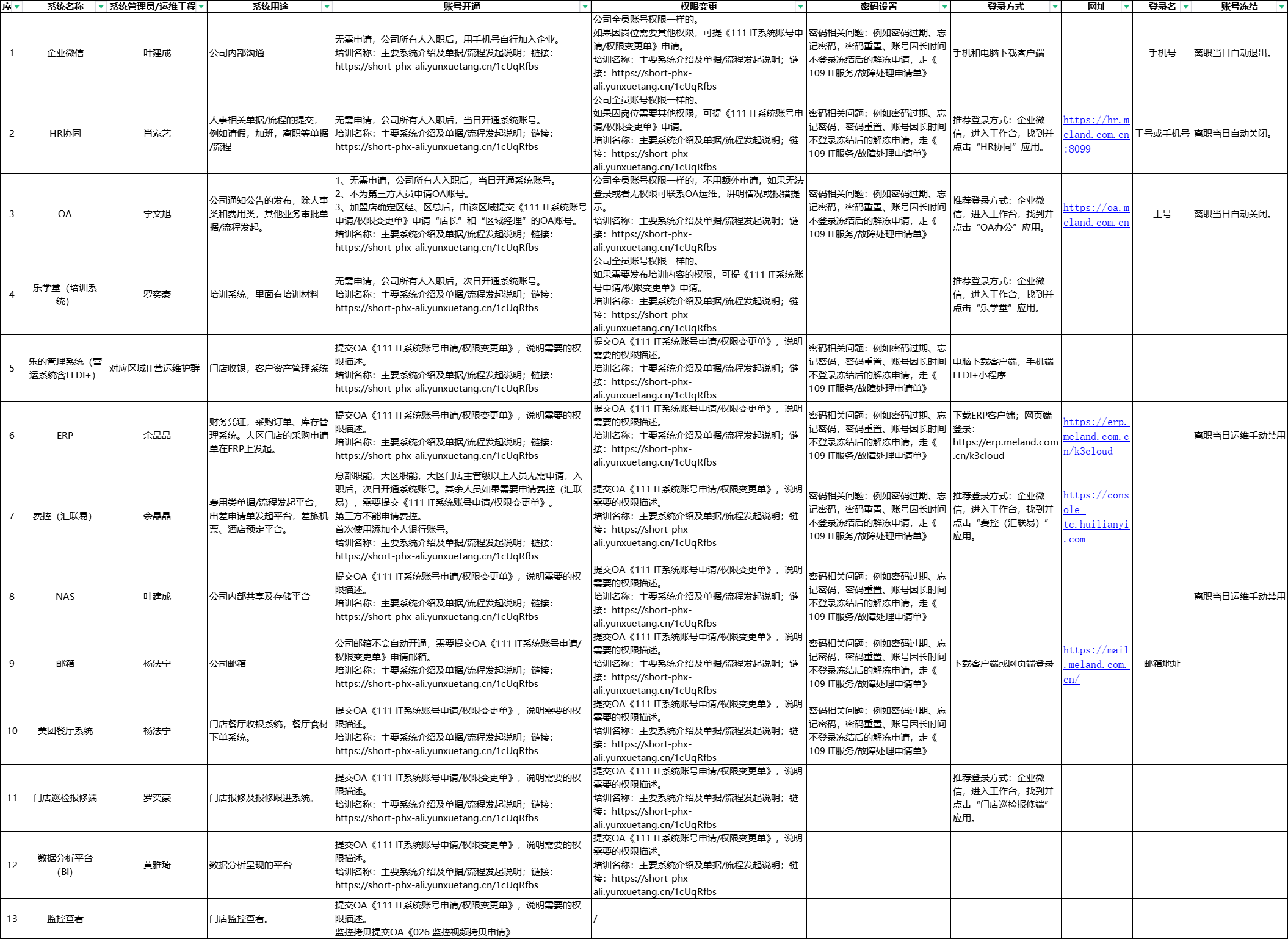 #### 应用场景: ##### (点击文字可以放大)  <span style="color:white;"> 序号 系统名称 系统管理员/运维工程师 系统用途 账号开通 权限变更 密码设置 登录方式 网址 登录名 账号冻结 1 企业微信 叶建成 公司内部沟通 "无需申请,公司所有人入职后,用手机号自行加入企业。 培训名称:主要系统介绍及单据/流程发起说明;链接:https://short-phx-ali.yunxuetang.cn/1cUqRfbs" "公司全员账号权限一样的。 如果因岗位需要其他权限,可提《111 IT系统账号申请/权限变更单》申请。 培训名称:主要系统介绍及单据/流程发起说明;链接:https://short-phx-ali.yunxuetang.cn/1cUqRfbs" 密码相关问题:例如密码过期、忘记密码,密码重置、账号因长时间不登录冻结后的解冻申请,走《109 IT服务/故障处理申请单》 手机和电脑下载客户端 手机号 离职当日自动退出。 2 HR协同 肖家艺 人事相关单据/流程的提交,例如请假,加班,离职等单据/流程 "无需申请,公司所有人入职后,当日开通系统账号。 培训名称:主要系统介绍及单据/流程发起说明;链接:https://short-phx-ali.yunxuetang.cn/1cUqRfbs" "公司全员账号权限一样的。 如果因岗位需要其他权限,可提《111 IT系统账号申请/权限变更单》申请。 培训名称:主要系统介绍及单据/流程发起说明;链接:https://short-phx-ali.yunxuetang.cn/1cUqRfbs" 密码相关问题:例如密码过期、忘记密码,密码重置、账号因长时间不登录冻结后的解冻申请,走《109 IT服务/故障处理申请单》 推荐登录方式:企业微信,进入工作台,找到并点击“HR协同”应用。 https://hr.meland.com.cn:8099 工号或手机号 离职当日自动关闭。 3 OA 宇文旭 公司通知公告的发布,除人事类和费用类,其他业务审批单据/流程发起。 "1、无需申请,公司所有人入职后,当日开通系统账号。 2、不为第三方人员申请OA账号。 3、加盟店确定区经、区总后,由该区域提交《111 IT系统账号申请/权限变更单》申请“店长”和“区域经理”的OA账号。 培训名称:主要系统介绍及单据/流程发起说明;链接:https://short-phx-ali.yunxuetang.cn/1cUqRfbs" "公司全员账号权限一样的,不用额外申请,如果无法登录或者无权限可联系OA运维,讲明情况或报错提示。 培训名称:主要系统介绍及单据/流程发起说明;链接:https://short-phx-ali.yunxuetang.cn/1cUqRfbs" 密码相关问题:例如密码过期、忘记密码,密码重置、账号因长时间不登录冻结后的解冻申请,走《109 IT服务/故障处理申请单》 推荐登录方式:企业微信,进入工作台,找到并点击“OA办公”应用。 https://oa.meland.com.cn 工号 离职当日自动关闭。 4 乐学堂(培训系统) 罗奕豪 培训系统,里面有培训材料 "无需申请,公司所有人入职后,次日开通系统账号。 培训名称:主要系统介绍及单据/流程发起说明;链接:https://short-phx-ali.yunxuetang.cn/1cUqRfbs" "公司全员账号权限一样的。 如果需要发布培训内容的权限,可提《111 IT系统账号申请/权限变更单》申请。 培训名称:主要系统介绍及单据/流程发起说明;链接:https://short-phx-ali.yunxuetang.cn/1cUqRfbs" 推荐登录方式:企业微信,进入工作台,找到并点击“乐学堂”应用。 5 乐的管理系统(营运系统含LEDI+) 对应区域IT营运维护群 门店收银,客户资产管理系统 "提交OA《111 IT系统账号申请/权限变更单》,说明需要的权限描述。 培训名称:主要系统介绍及单据/流程发起说明;链接:https://short-phx-ali.yunxuetang.cn/1cUqRfbs" "提交OA《111 IT系统账号申请/权限变更单》,说明需要的权限描述。 培训名称:主要系统介绍及单据/流程发起说明;链接:https://short-phx-ali.yunxuetang.cn/1cUqRfbs" 密码相关问题:例如密码过期、忘记密码,密码重置、账号因长时间不登录冻结后的解冻申请,走《109 IT服务/故障处理申请单》 电脑下载客户端,手机端LEDI+小程序 6 ERP 余晶晶 财务凭证,采购订单、库存管理系统。大区门店的采购申请单在ERP上发起。 "提交OA《111 IT系统账号申请/权限变更单》,说明需要的权限描述。 培训名称:主要系统介绍及单据/流程发起说明;链接:https://short-phx-ali.yunxuetang.cn/1cUqRfbs" "提交OA《111 IT系统账号申请/权限变更单》,说明需要的权限描述。 培训名称:主要系统介绍及单据/流程发起说明;链接:https://short-phx-ali.yunxuetang.cn/1cUqRfbs" 密码相关问题:例如密码过期、忘记密码,密码重置、账号因长时间不登录冻结后的解冻申请,走《109 IT服务/故障处理申请单》 下载ERP客户端;网页端登录:https://erp.meland.com.cn/k3cloud https://erp.meland.com.cn/k3cloud 离职当日运维手动禁用 7 费控(汇联易) 余晶晶 费用类单据/流程发起平台,出差申请单发起平台,差旅机票、酒店预定平台。 "总部职能,大区职能,大区门店主管级以上人员无需申请,入职后,次日开通系统账号。其余人员如果需要申请费控(汇联易),需要提交《111 IT系统账号申请/权限变更单》。 第三方不能申请费控。 首次使用添加个人银行账号。 培训名称:主要系统介绍及单据/流程发起说明;链接:https://short-phx-ali.yunxuetang.cn/1cUqRfbs" "提交OA《111 IT系统账号申请/权限变更单》,说明需要的权限描述。 培训名称:主要系统介绍及单据/流程发起说明;链接:https://short-phx-ali.yunxuetang.cn/1cUqRfbs" 密码相关问题:例如密码过期、忘记密码,密码重置、账号因长时间不登录冻结后的解冻申请,走《109 IT服务/故障处理申请单》 推荐登录方式:企业微信,进入工作台,找到并点击“费控(汇联易)”应用。 https://console-tc.huilianyi.com 8 NA